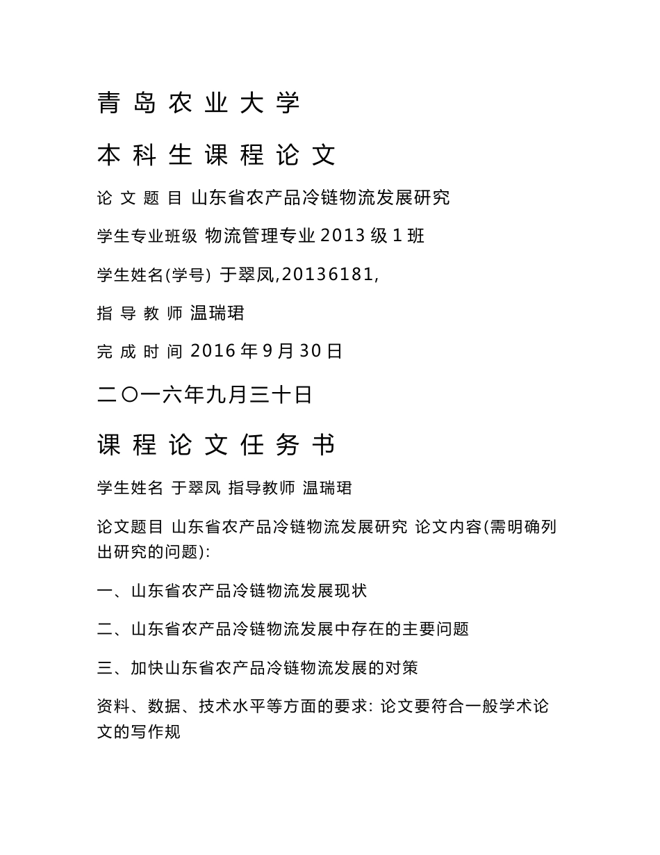 青岛农业大学本科生课程论文论文题目山东省农产品冷链物流发展研究学生专业班级物流管理专业2013级1班学生姓名(学号)于翠凤,20136181,指导...