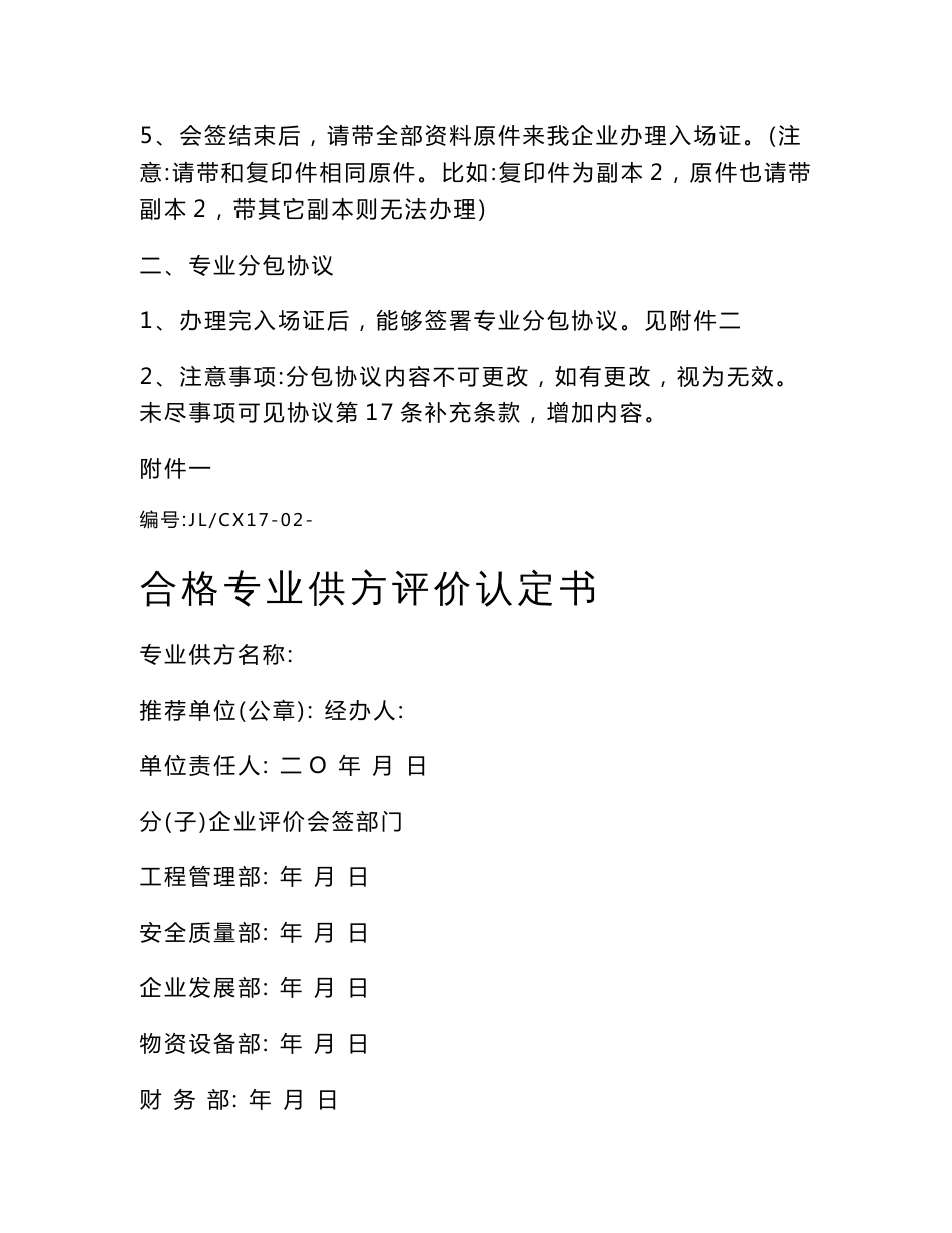 专业分包协议签署步骤一、专业合格供方1、凡签署专业协议前,必需先办理专业合格供方。2、专业合格供方办理条件:(1)持企业四证一照,并加盖...