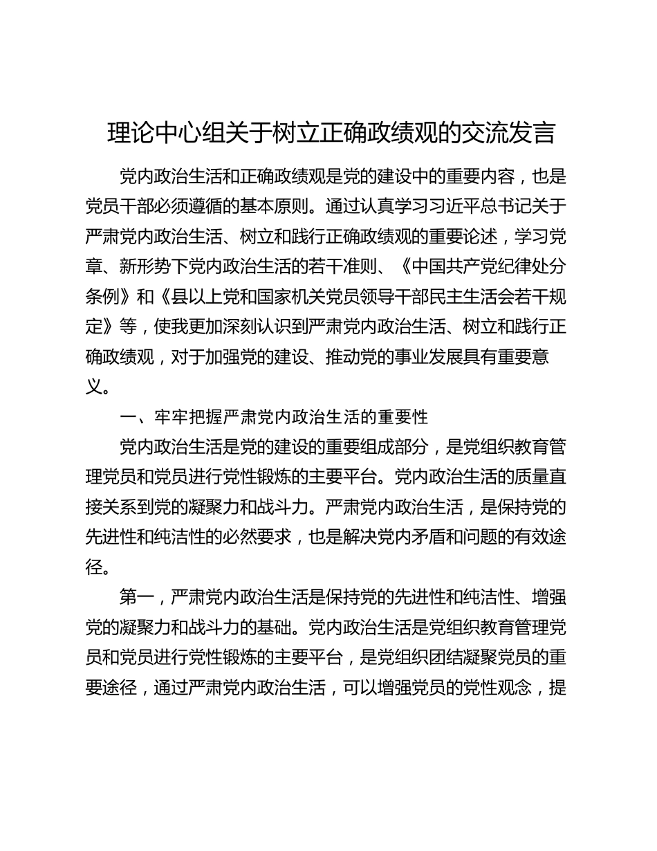 理论中心组关于树立正确政绩观的交流发言党内政治生活和正确政绩观是党的建设中的重要内容,也是党员干部必须遵循的基本原则。通过认真学习...