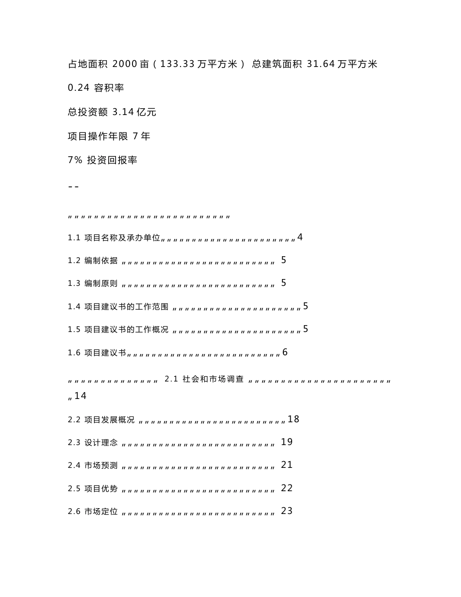 占地面积2000亩(133.33万平方米)总建筑面积31.64万平方米0.24容积率总投资额3.14亿元项目操作年限7年7%投资回报率--„„„„„„„„„„...