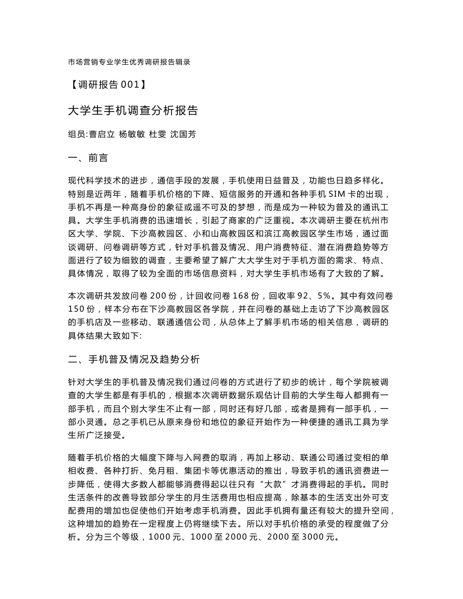 市场营销专业学生优秀调研报告辑录【调研报告001】大学生手机调查分析报告组员:曹启立杨敏敏杜雯沈国芳一、前言现代科学技术的进步,通信手...