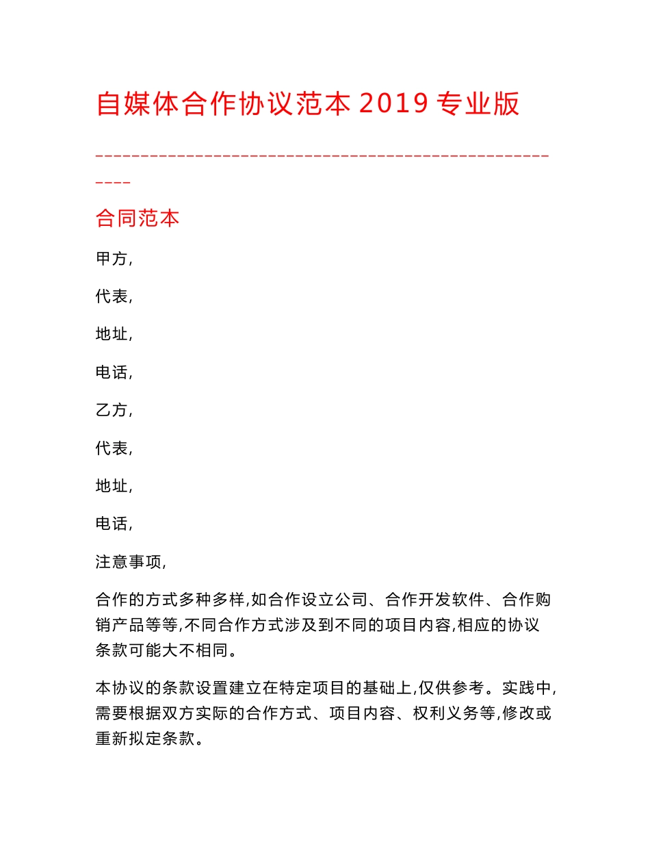 自媒体合作协议范本2019专业版______________________________________________________合同范本甲方,代表,地址,电话,乙方,代表,地址,电话,...