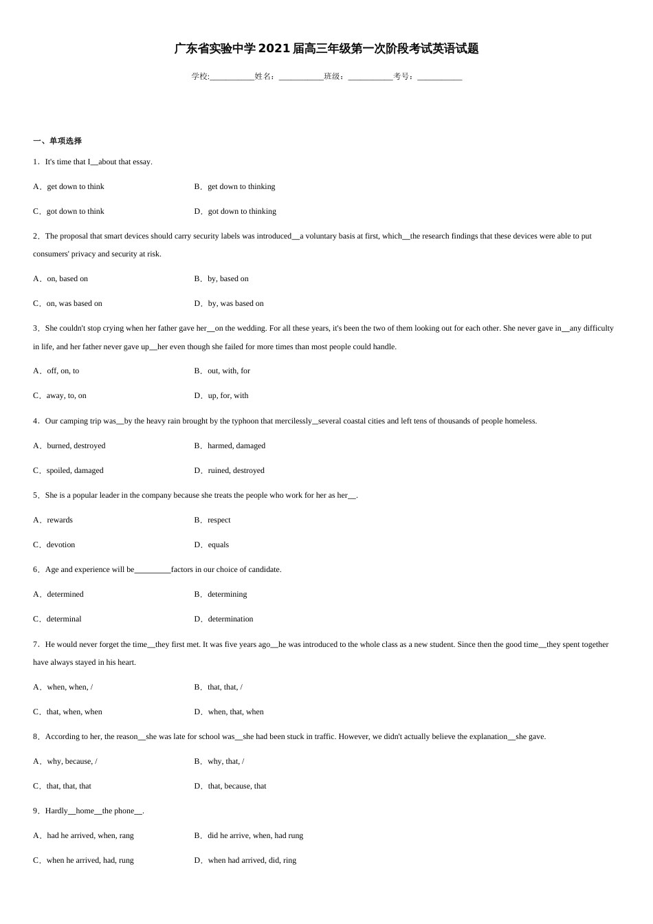 广东省实验中学2021届高三年级第一次阶段考试英语试题学校:___________姓名:___________班级:___________考号:___________一、单项选择1...