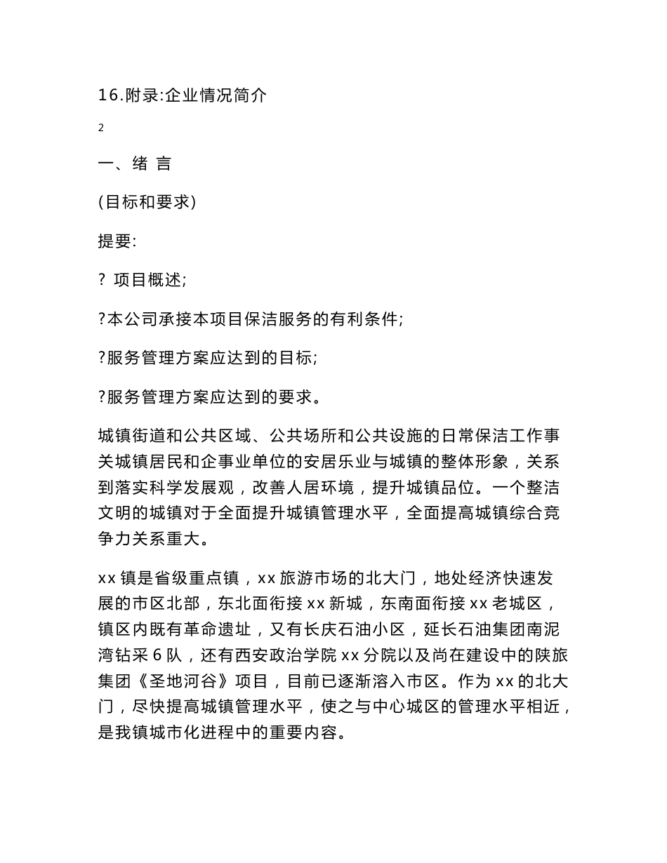 xxxx市xx区xx物业服务有限公司1目录1.绪言2.保洁管理整体设想及策划(包括管理定位、管理目标、管理模式、管理措施等。)3.管理方式和工作计...