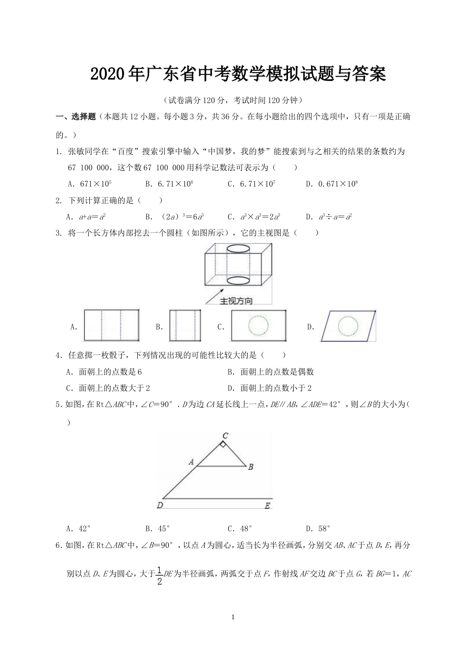 2020年广东省中考数学模拟试题与答案(试卷满分120分,考试时间120分钟)一、选择题(本题共12小题。每小题3分,共36分。在每小题给出的四...