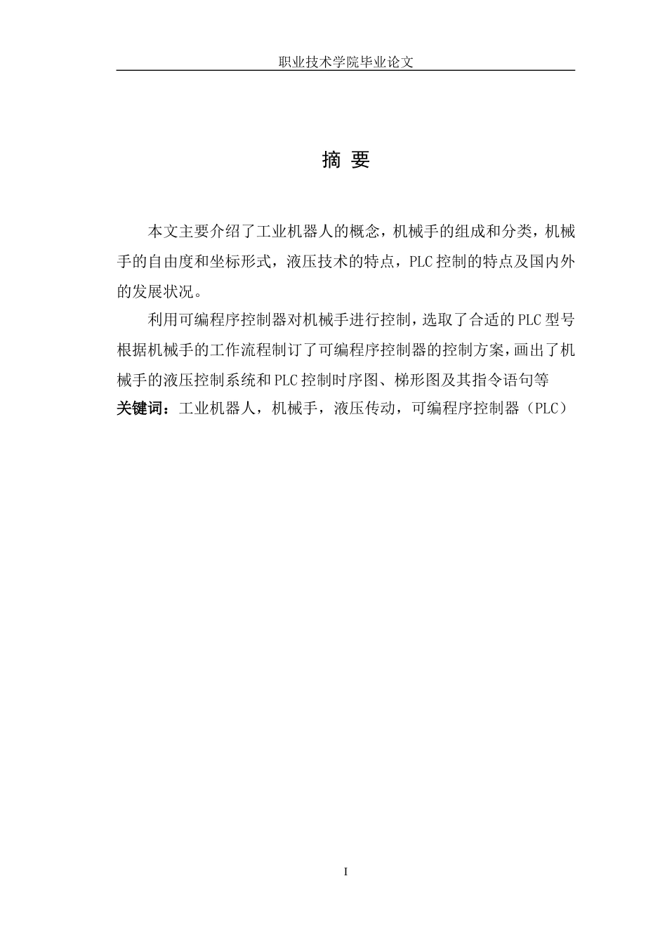 职业技术学院毕业论文摘要本文主要介绍了工业机器人的概念,机械手的组成和分类,机械手的自由度和坐标形式,液压技术的特点,PLC控制的特...