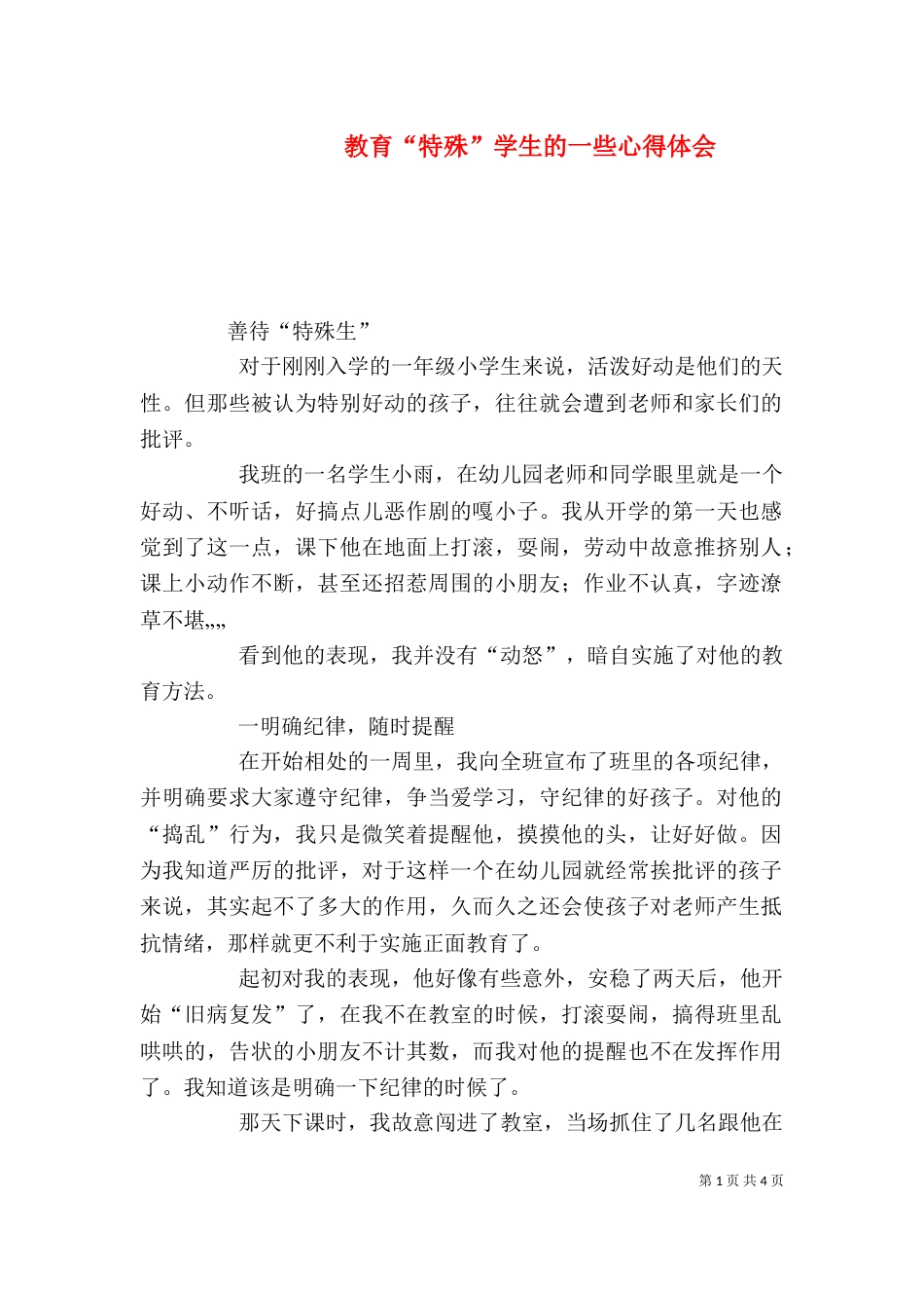 第1页共4页教育“特殊”学生的一些心得体会善待“特殊生”对于刚刚入学的一年级小学生来说,活泼好动是他们的天性。但那些被认为特别好动的...