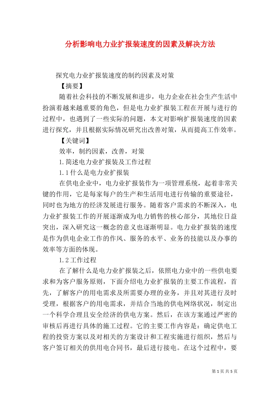 第1页共5页书山有路勤为径,学海无涯苦作舟。分析影响电力业扩报装速度的因素及解决方法探究电力业扩报装速度的制约因素及对策【摘要】随着...