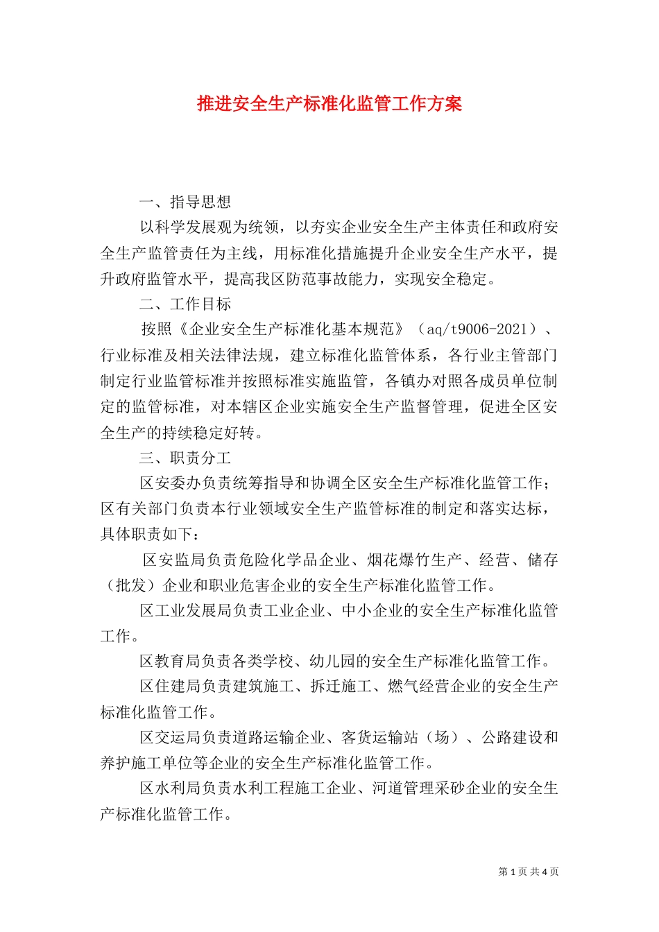 第1页共4页书山有路勤为径,学海无涯苦作舟。推进安全生产标准化监管工作方案一、指导思想以科学发展观为统领,以夯实企业安全生产主体责任...