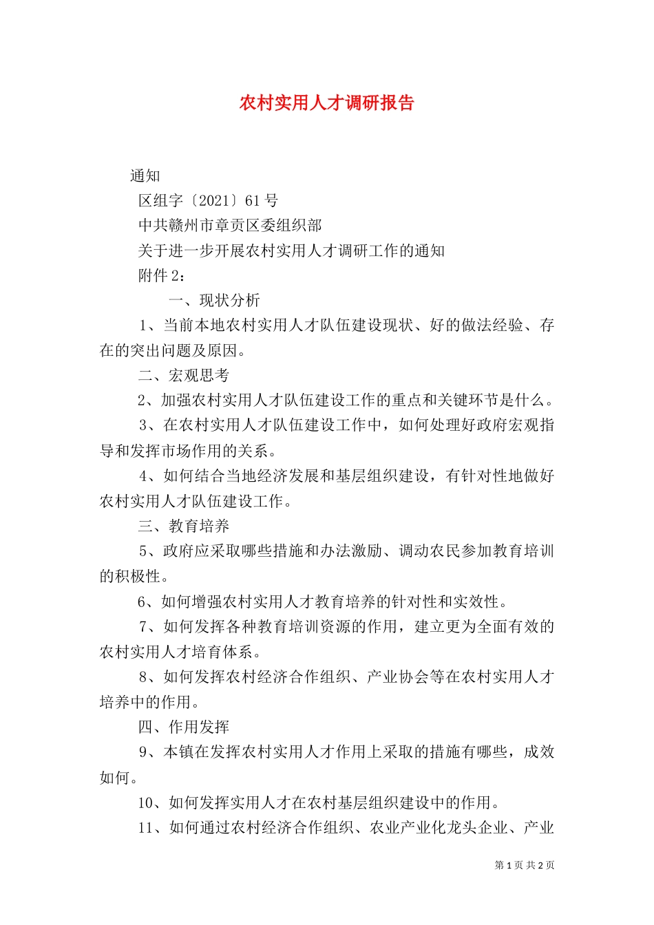 第1页共2页书山有路勤为径,学海无涯苦作舟。农村实用人才调研报告通知区组字〔2021〕61号中共赣州市章贡区委组织部关于进一步开展农村实用...