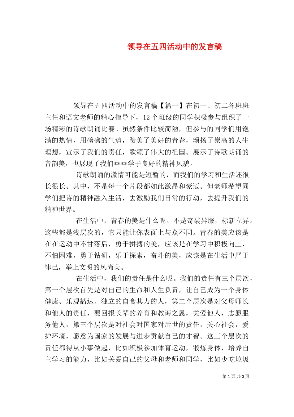 第1页共3页领导在五四活动中的发言稿领导在五四活动中的发言稿【篇一】在初一、初二各班班主任和语文老师的精心指导下,12个班级的同学积极...