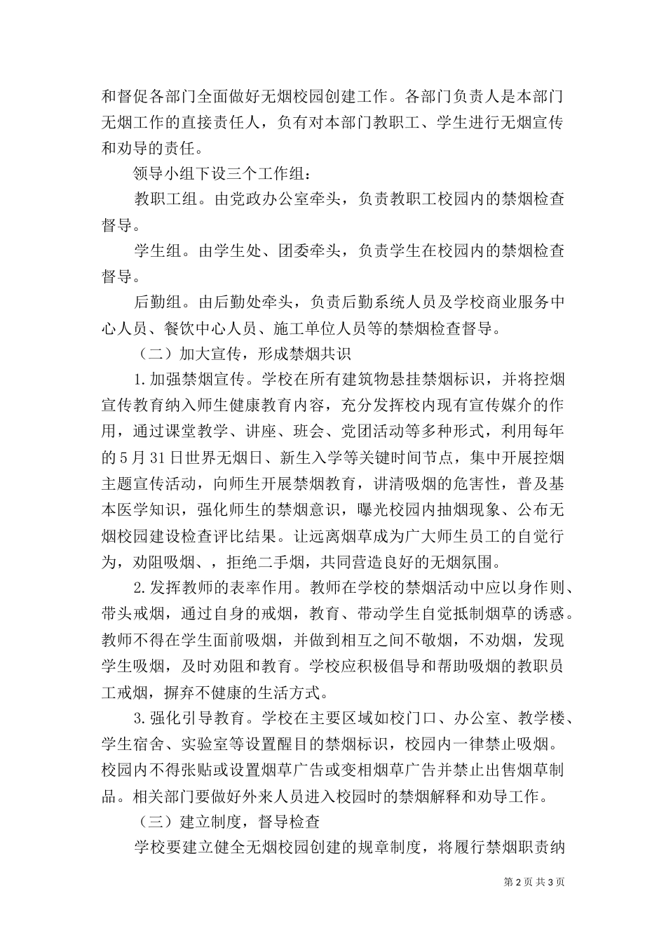 第1页共3页创建无烟校园实施方案创建无烟校园实施方案根据教育部《关于在全国各级各类学校禁烟有关事项的通知》要求,为进一步加强学校精神...