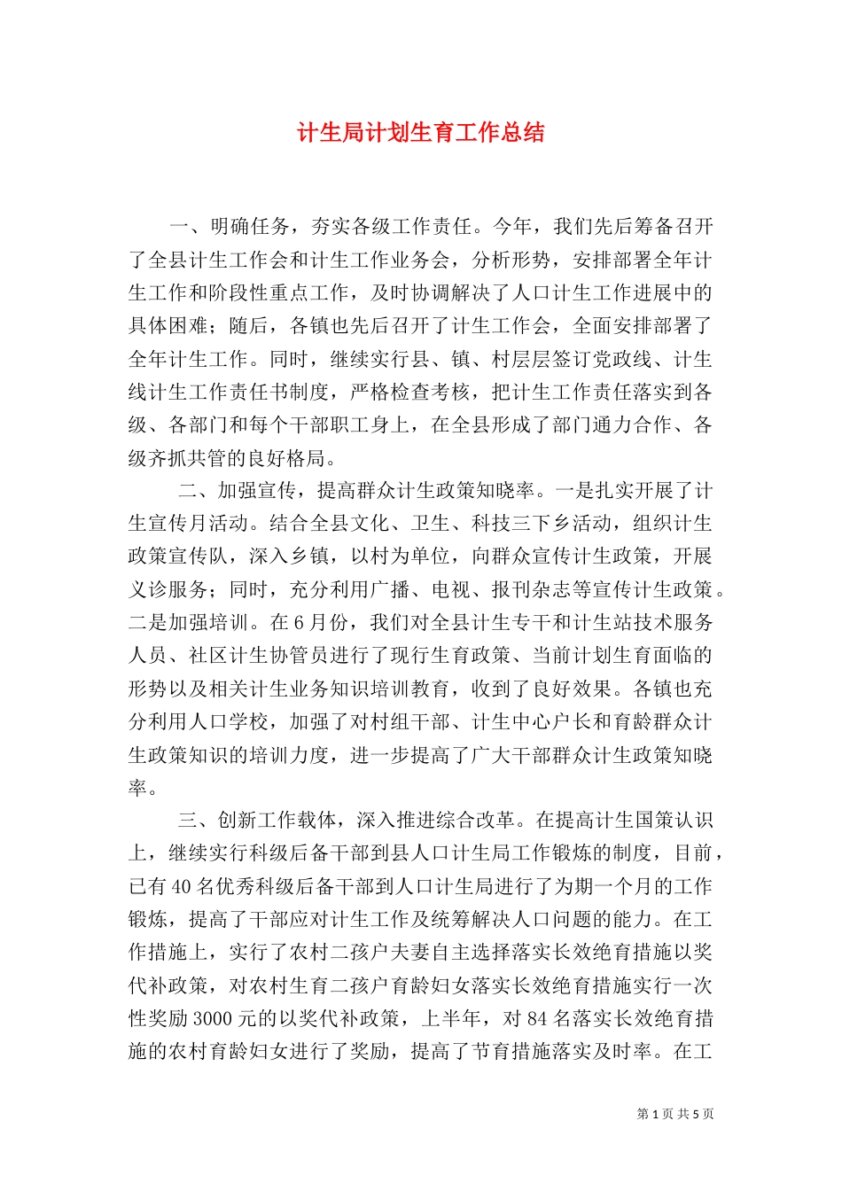 第1页共5页书山有路勤为径,学海无涯苦作舟。计生局计划生育工作总结一、明确任务,夯实各级工作责任。今年,我们先后筹备召开了全县计生工...