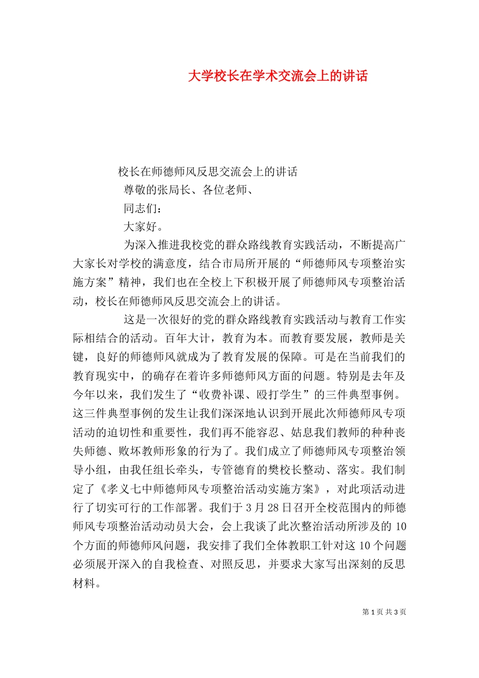 第1页共3页大学校长在学术交流会上的讲话校长在师德师风反思交流会上的讲话尊敬的张局长、各位老师、同志们:大家好。为深入推进我校党的群...