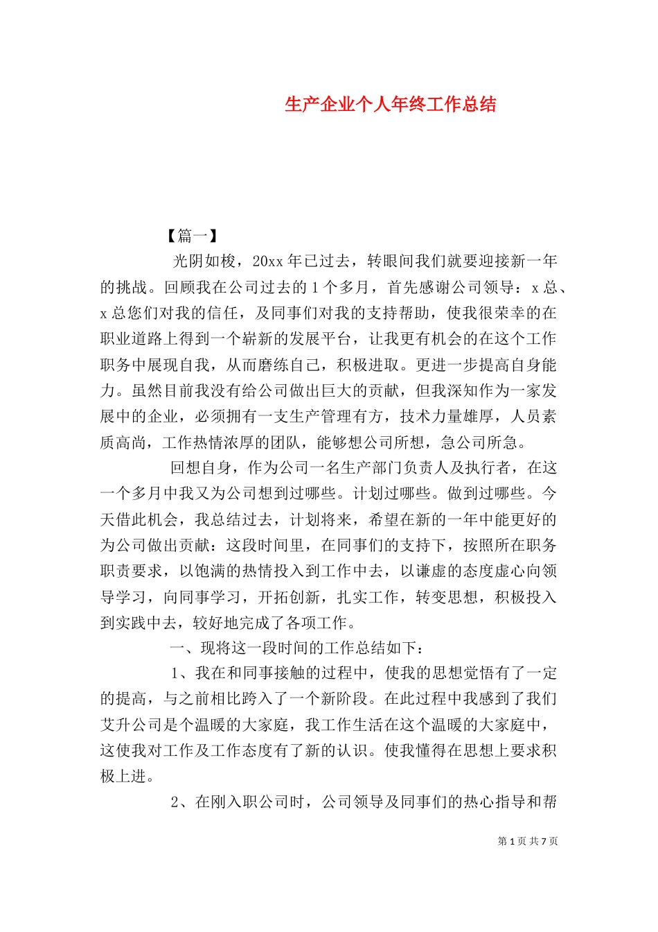 第1页共7页生产企业个人年终工作总结【篇一】光阴如梭,20xx年已过去,转眼间我们就要迎接新一年的挑战。回顾我在公司过去的1个多月,首先...