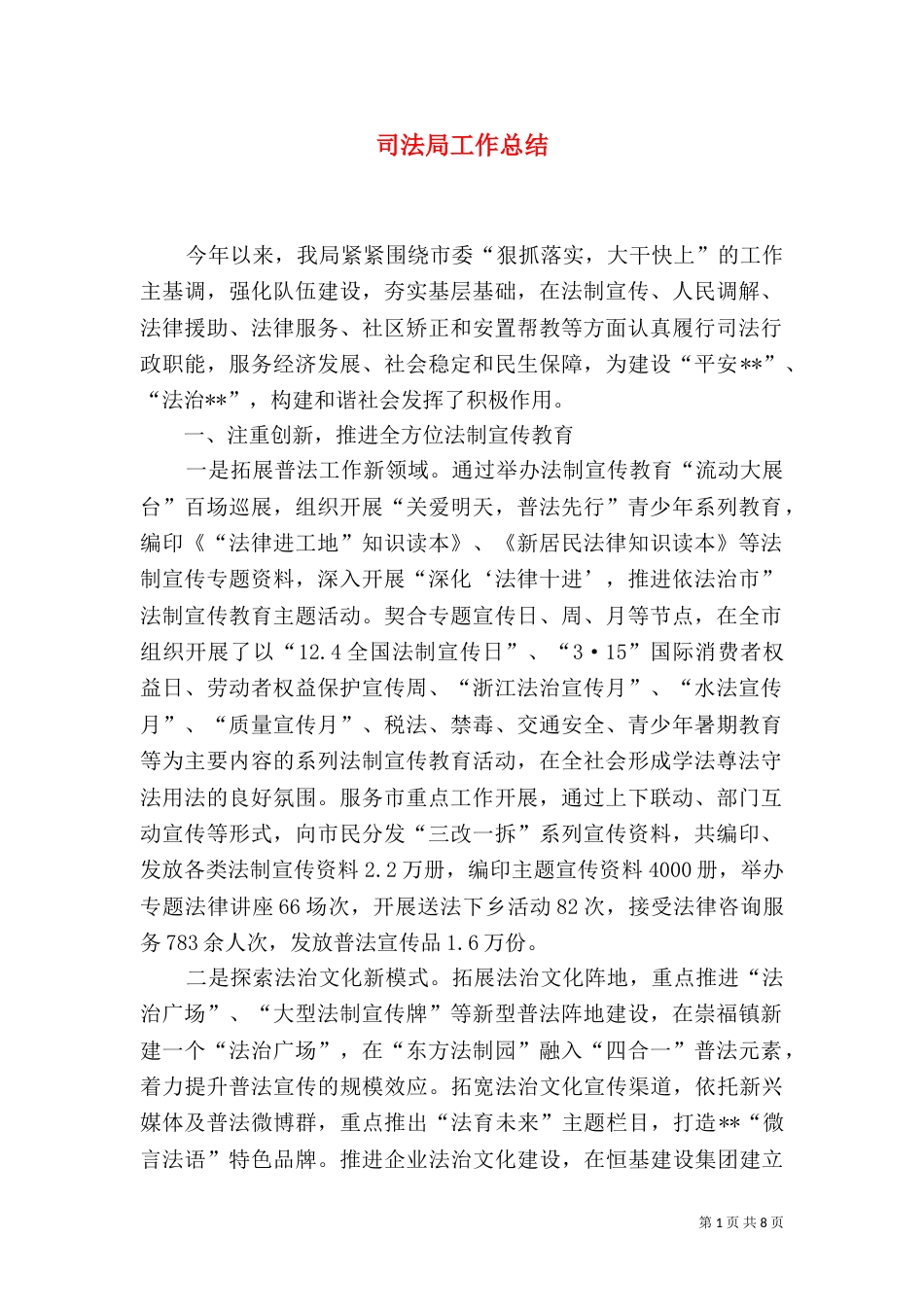 第1页共8页司法局工作总结今年以来,我局紧紧围绕市委“狠抓落实,大干快上”的工作主基调,强化队伍建设,夯实基层基础,在法制宣传、人民...