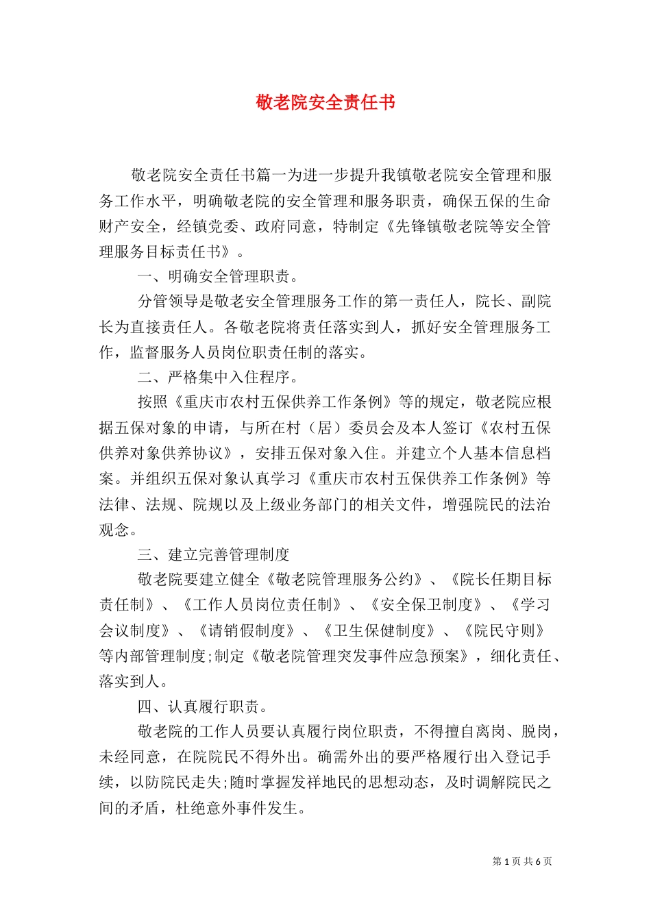 第1页共6页书山有路勤为径,学海无涯苦作舟。敬老院安全责任书敬老院安全责任书篇一为进一步提升我镇敬老院安全管理和服务工作水平,明确敬...