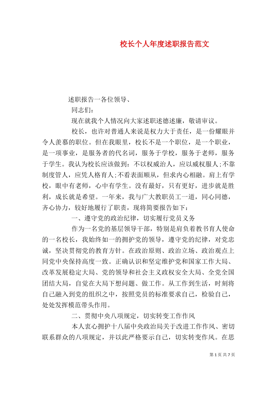 第1页共7页校长个人年度述职报告范文述职报告一各位领导、同志们:现在就我个人情况向大家述职述德述廉,敬请审议。校长,也许对普通人来说...