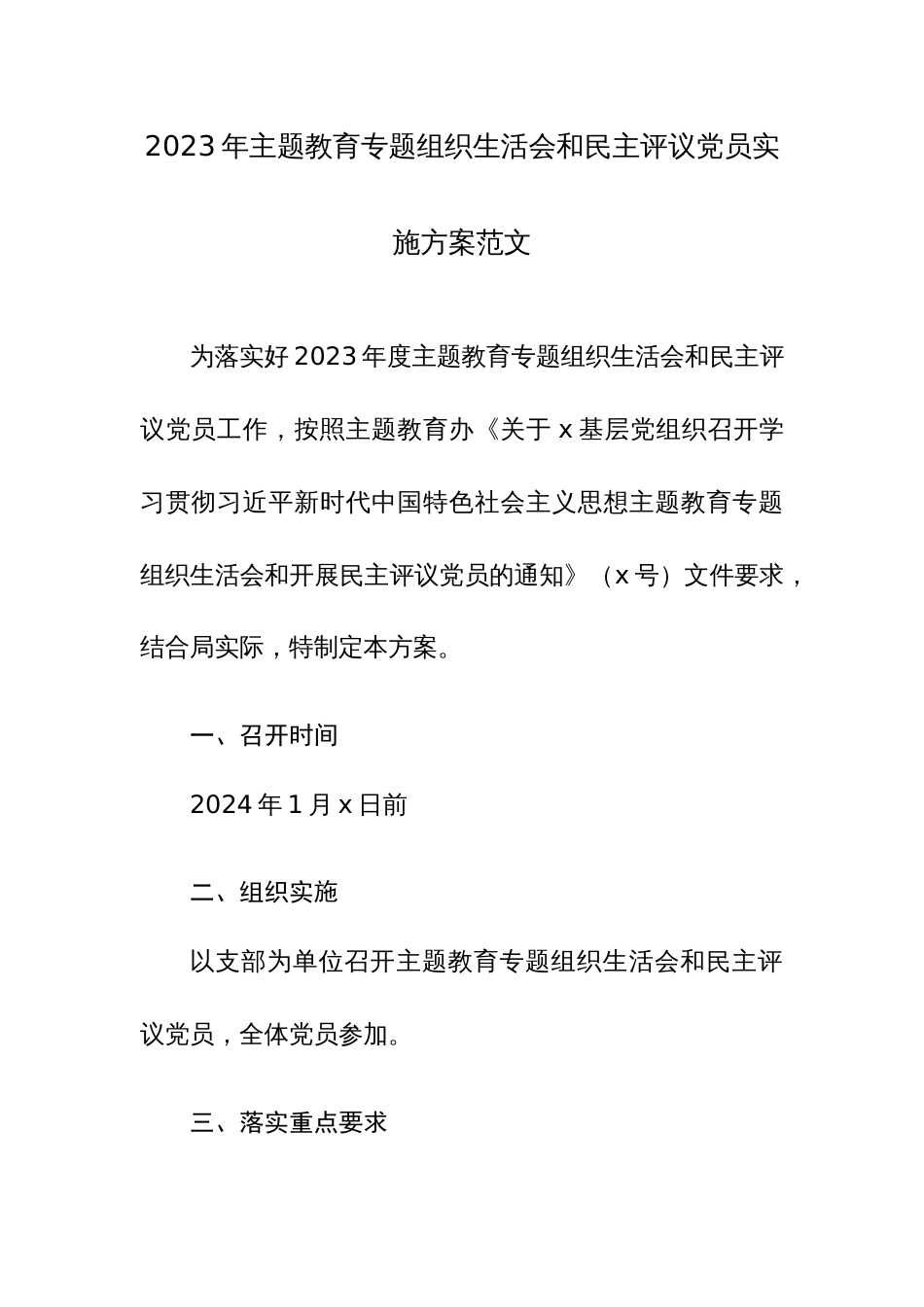 2023年主题教育专题组织生活会和民主评议党员实施方案范文