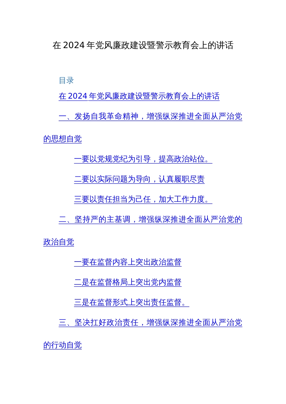 在2024年党风廉政建设暨警示教育会上的讲话目录在2024年党风廉政建设暨警示教育会上的讲话一、发扬自我革命精神,增强纵深推进全面从严治党...