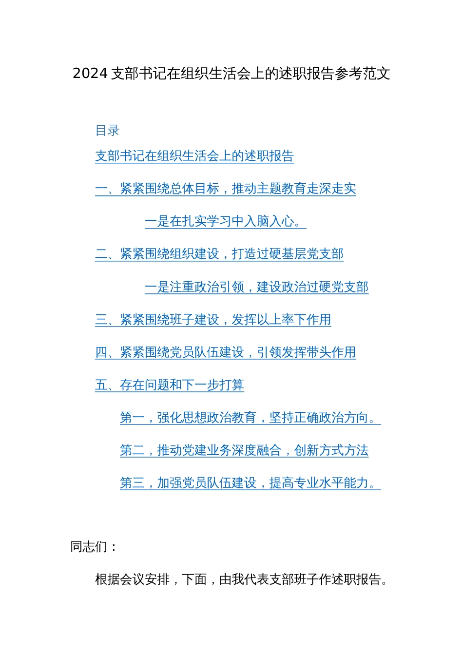 2024支部书记在组织生活会上的述职报告参考范文_第1页
