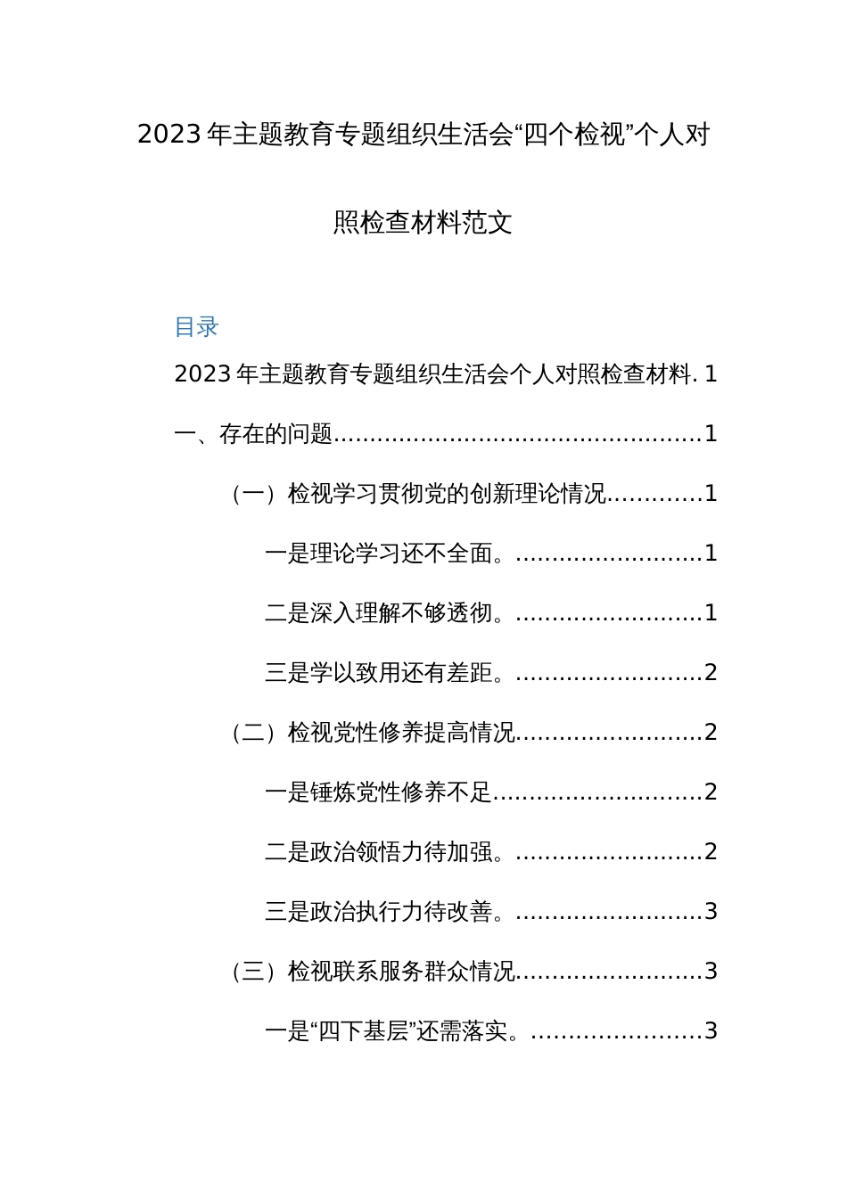 2023年主题教育专题组织生活会“四个检视”个人对照检查材料范文目录2023年主题教育专题组织生活会个人对照检查材料.1一、存在的问题.........