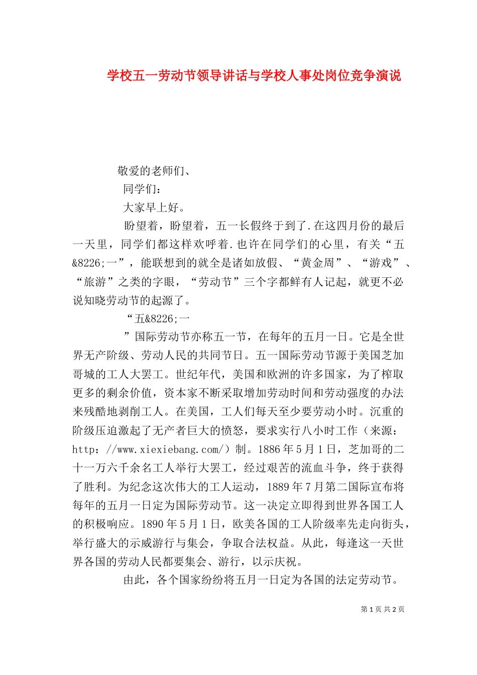学校五一劳动节领导讲话与学校人事处岗位竞争演说(二)_第1页