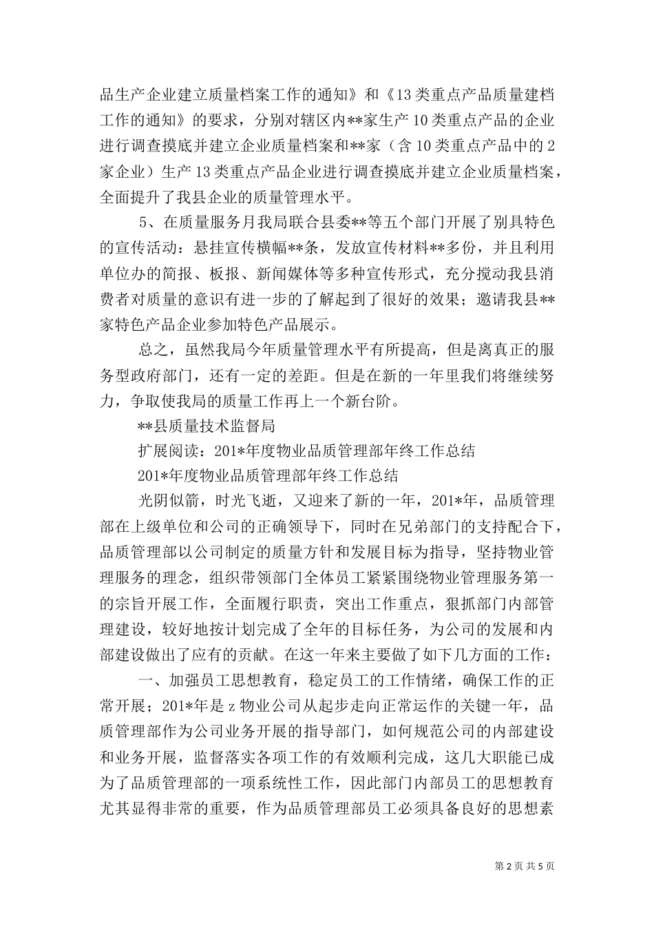 第1页共5页书山有路勤为径,学海无涯苦作舟。年度质量管理年终工作总结**对照年初定的质量管理工作计划,我局紧贴本县实际,以服从当地政府...