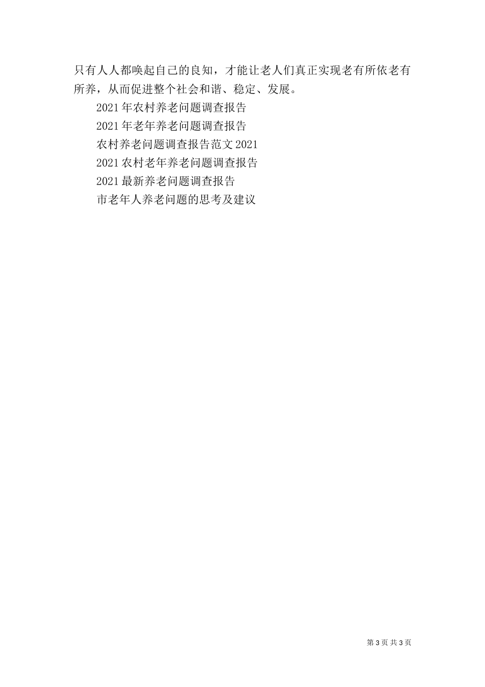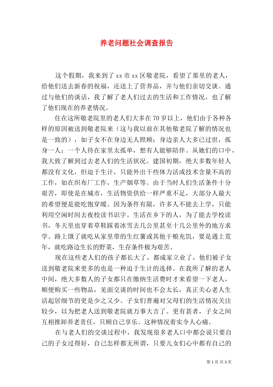 第1页共3页养老问题社会调查报告这个假期,我来到了xx市xx区敬老院,看望了那里的老人,给他们送去新春的祝福,还送上了营养品,并与他们亲...
