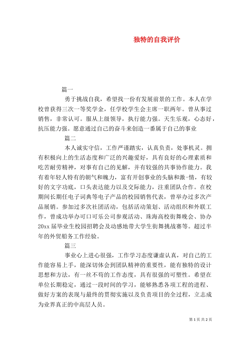 第1页共2页独特的自我评价篇一勇于挑战自我,希望找一份有发展前景的工作。本人在学校曾获得三次一等奖学金,任学校学生会主席一职两年。曾...