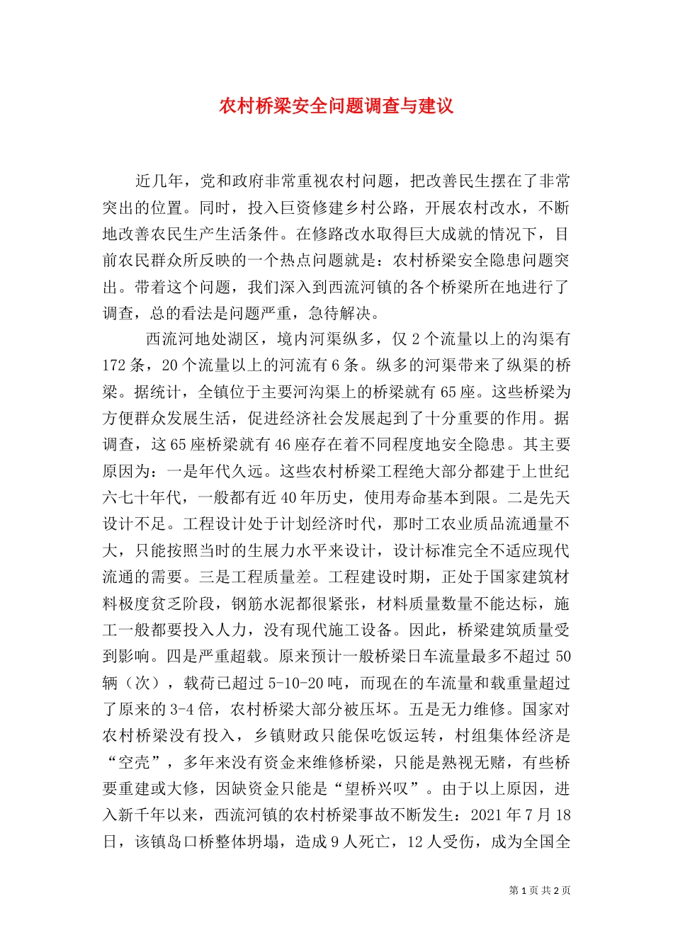 第1页共2页书山有路勤为径,学海无涯苦作舟。农村桥梁安全问题调查与建议近几年,党和政府非常重视农村问题,把改善民生摆在了非常突出的位...