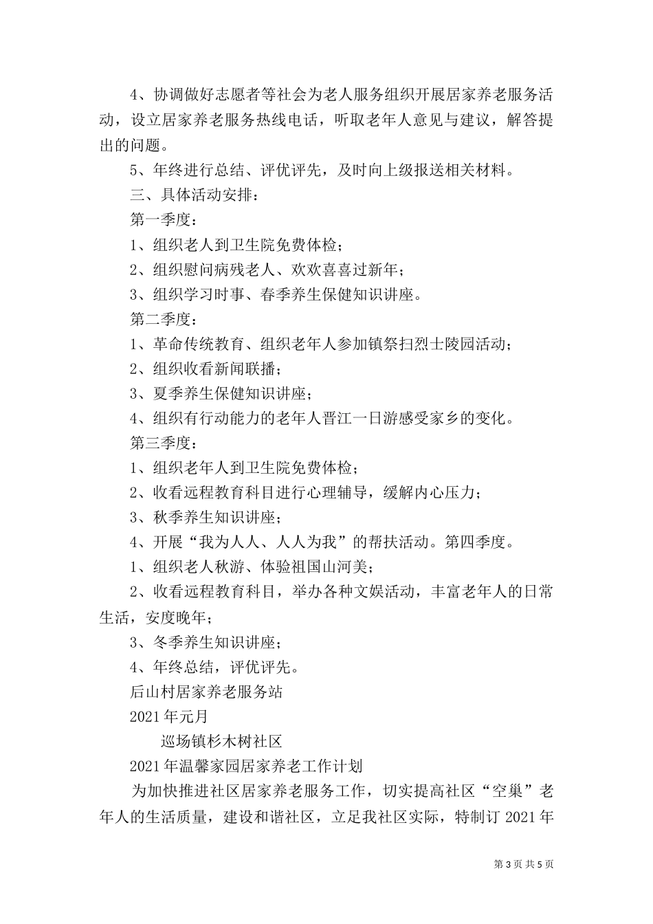 第1页共5页居家养老工作计划社区居家养老服务站3-5年发展规划为了进一步做好社区居家养老服务工作,探讨居家养老工作新思路、新方法,使社...