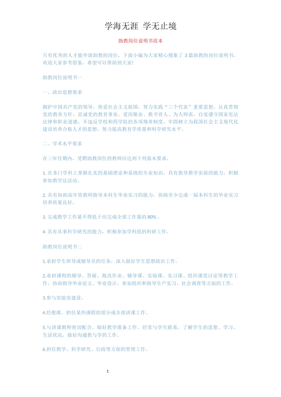 1学海无涯学无止境助教岗位说明书范本只有优秀的人才能申请助教的岗位,下面小编为大家精心搜集了3篇助教的岗位说明书,欢迎大家参考借鉴,...