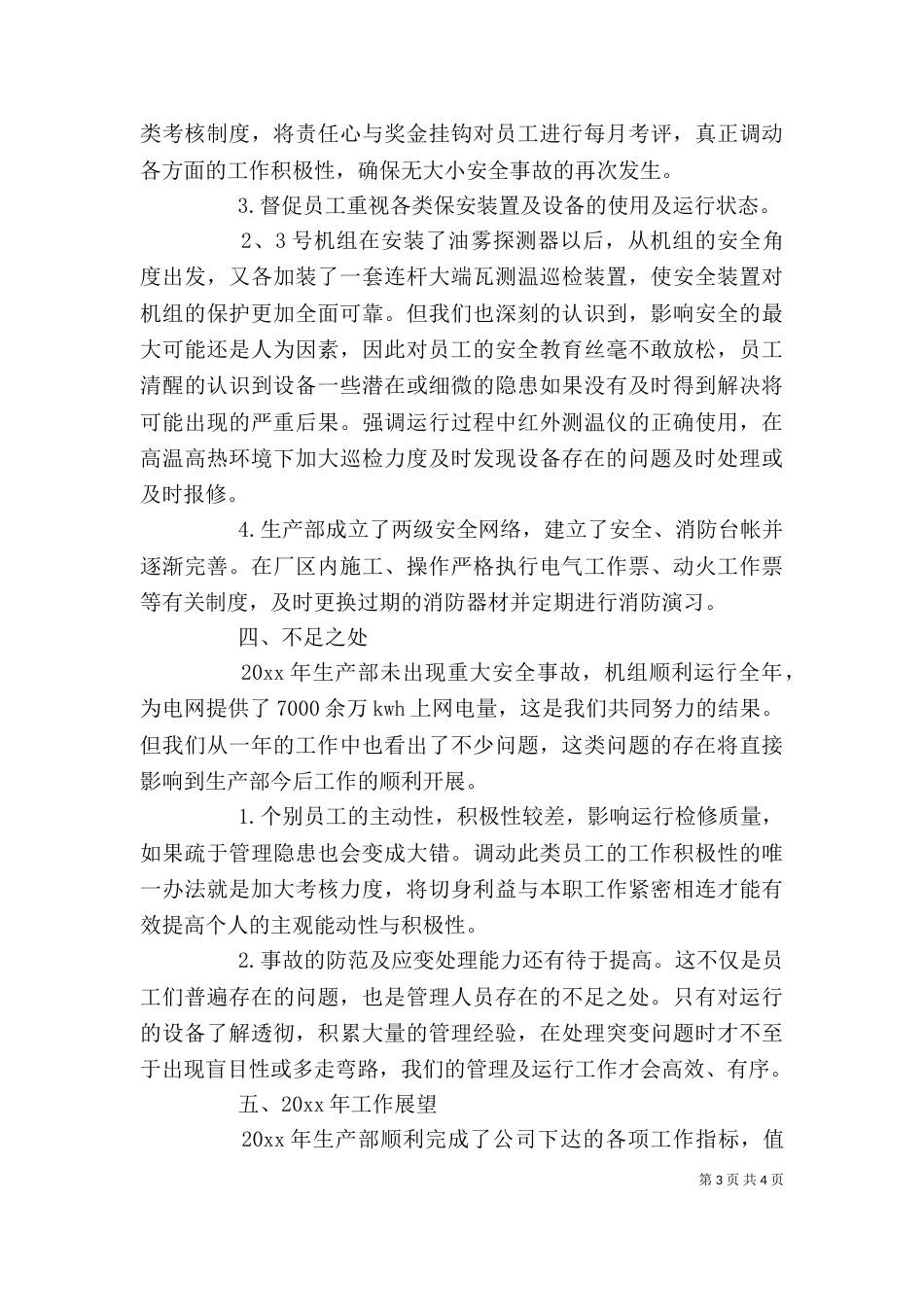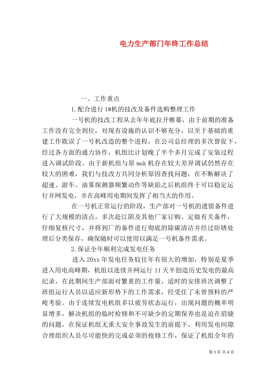 第1页共4页电力生产部门年终工作总结一、工作重点1.配合进行1#机的技改及备件选购整理工作一号机的技改工程从去年年底拉开帷幕,由于前期的...