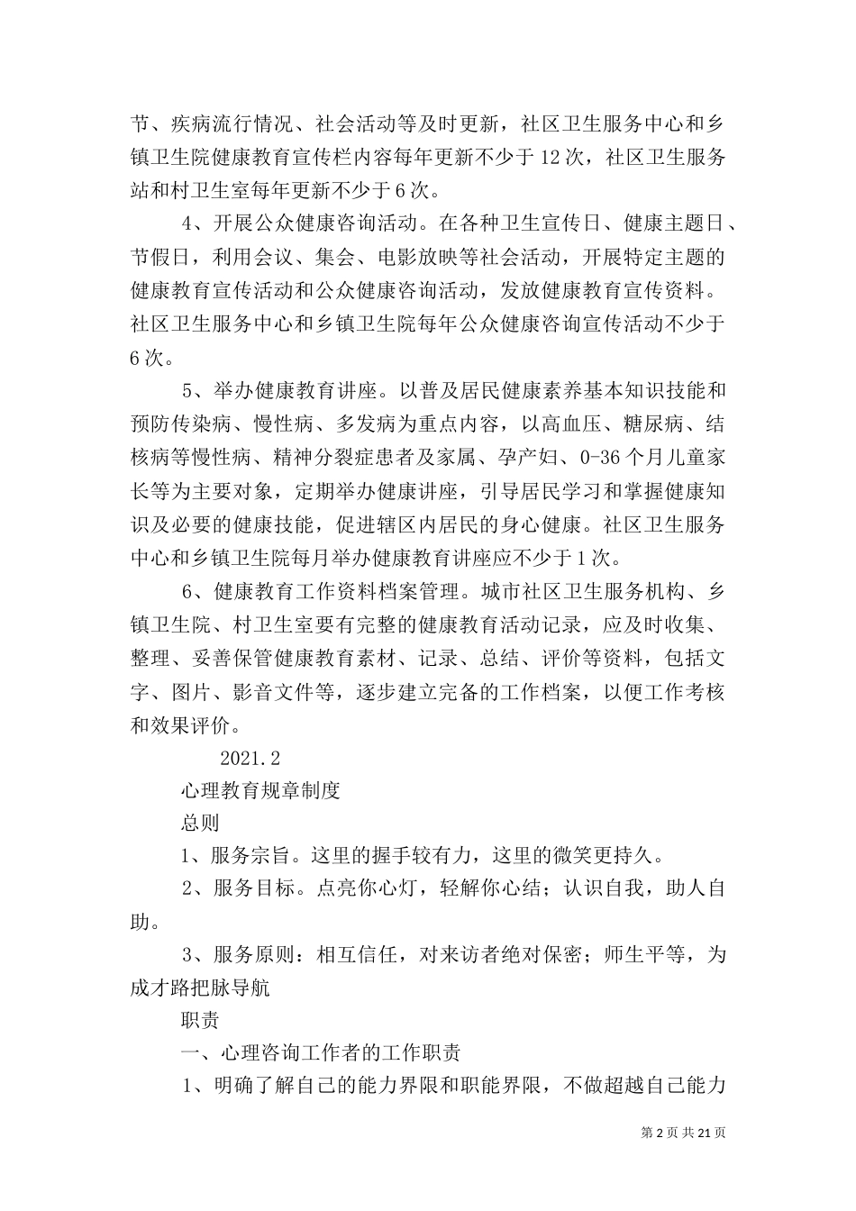 第1页共21页书山有路勤为径,学海无涯苦作舟。健康教育规章制度1.辖区居民健康教育。宣传普及《中国公民健康素养66条》。2.青少年、妇女、...