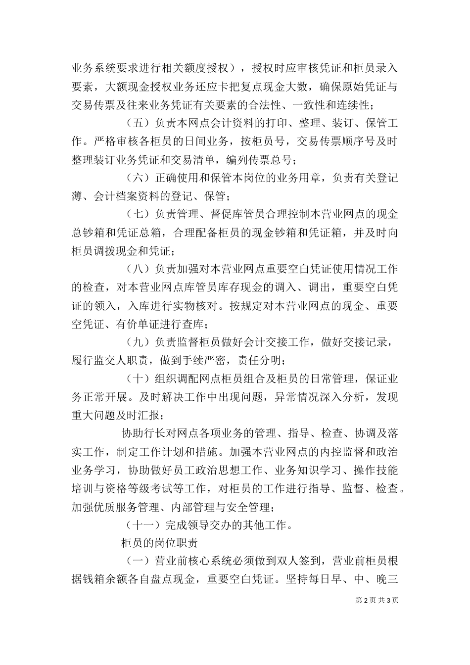 第1页共3页银行岗位支行长岗位职责:1运营管理:根据上级行下达的各项业务经营指标与总体计划,组织开展业务经营活动,落实上级行的经营策...