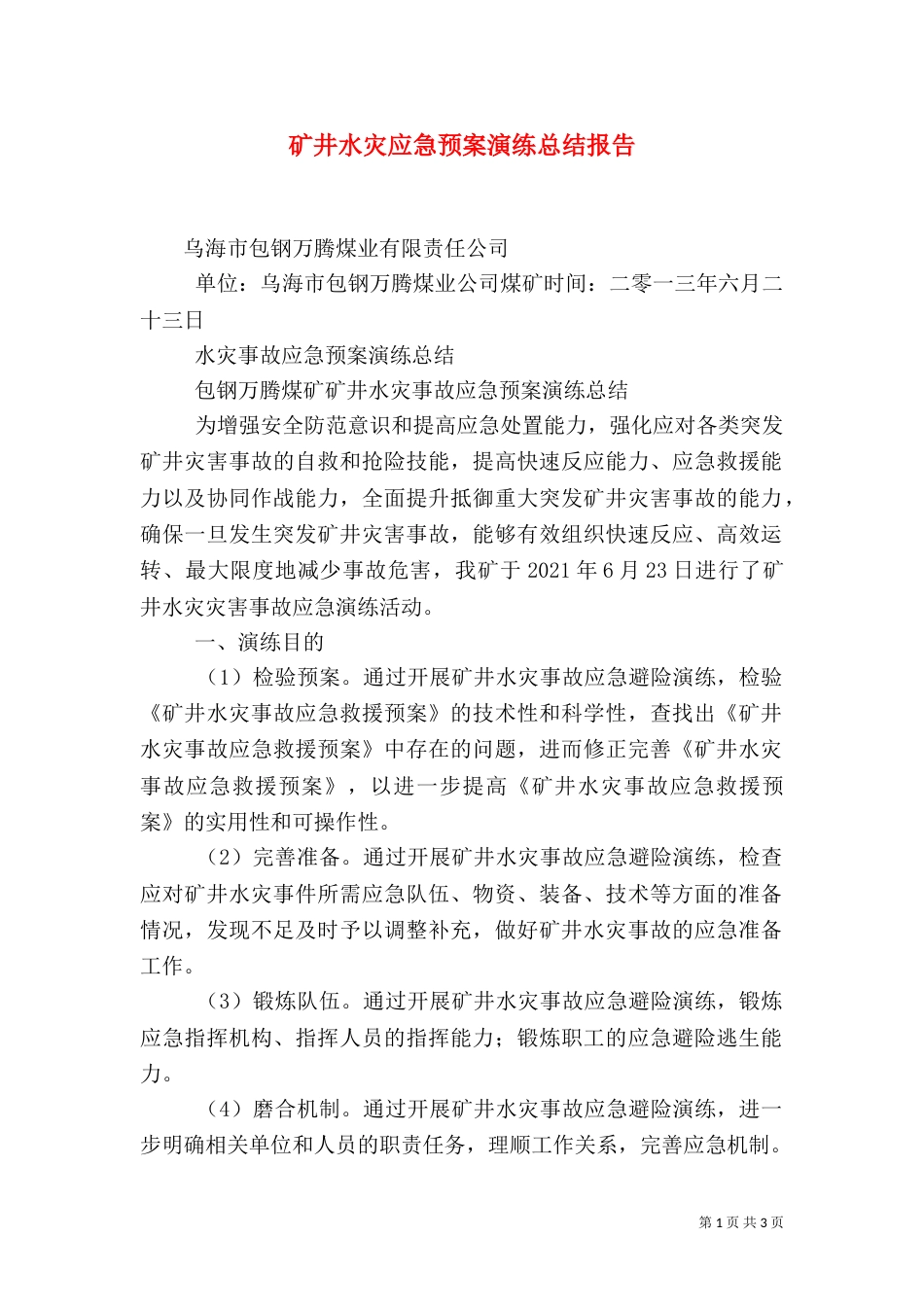 第1页共3页书山有路勤为径,学海无涯苦作舟。矿井水灾应急预案演练总结报告乌海市包钢万腾煤业有限责任公司单位:乌海市包钢万腾煤业公司煤...