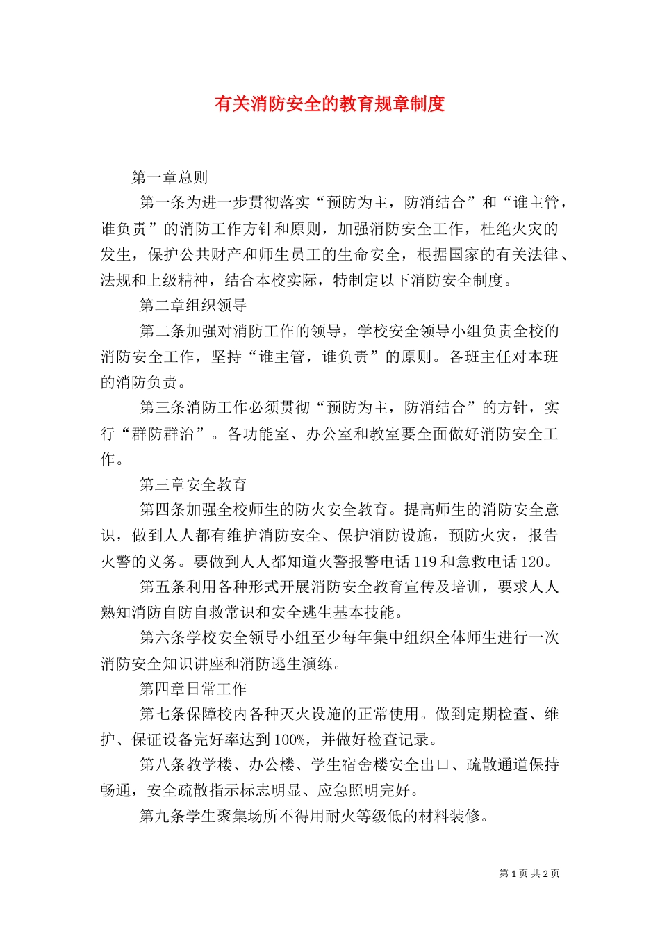第1页共2页书山有路勤为径,学海无涯苦作舟。有关消防安全的教育规章制度第一章总则第一条为进一步贯彻落实“预防为主,防消结合”和“谁主...