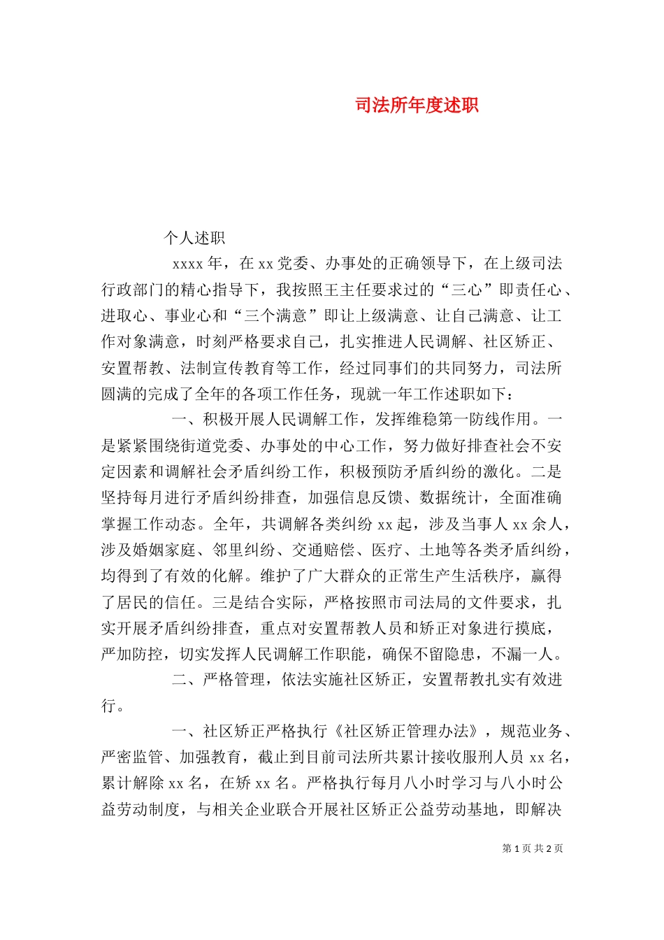 第1页共2页司法所年度述职个人述职xxxx年,在xx党委、办事处的正确领导下,在上级司法行政部门的精心指导下,我按照王主任要求过的“三心”...