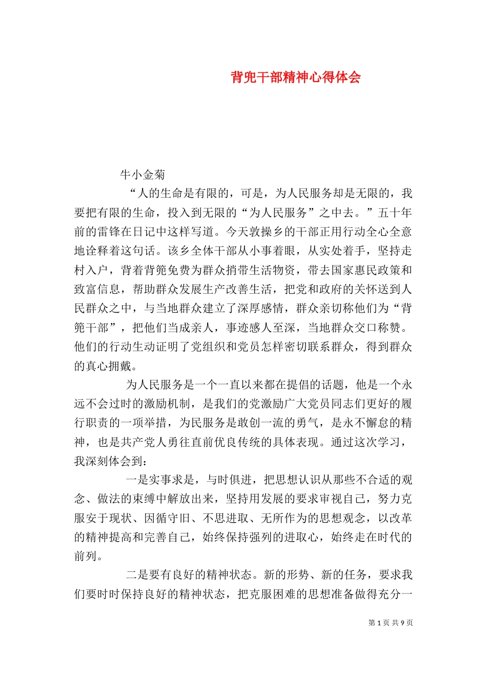 第1页共9页背兜干部精神心得体会牛小金菊“人的生命是有限的,可是,为人民服务却是无限的,我要把有限的生命,投入到无限的“为人民服务”...