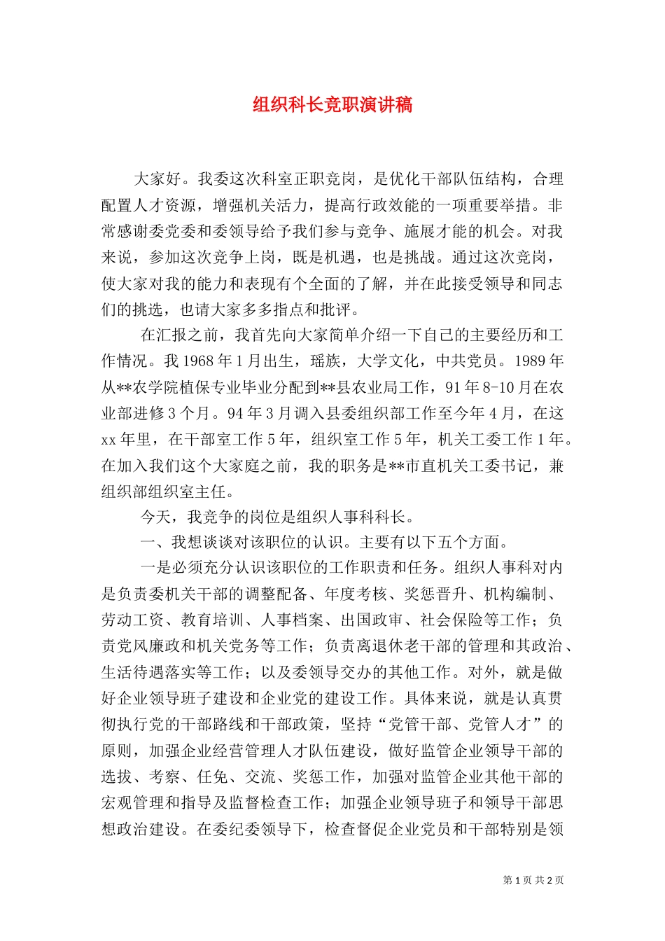 第1页共2页书山有路勤为径,学海无涯苦作舟。组织科长竞职演讲稿大家好。我委这次科室正职竞岗,是优化干部队伍结构,合理配置人才资源,增...