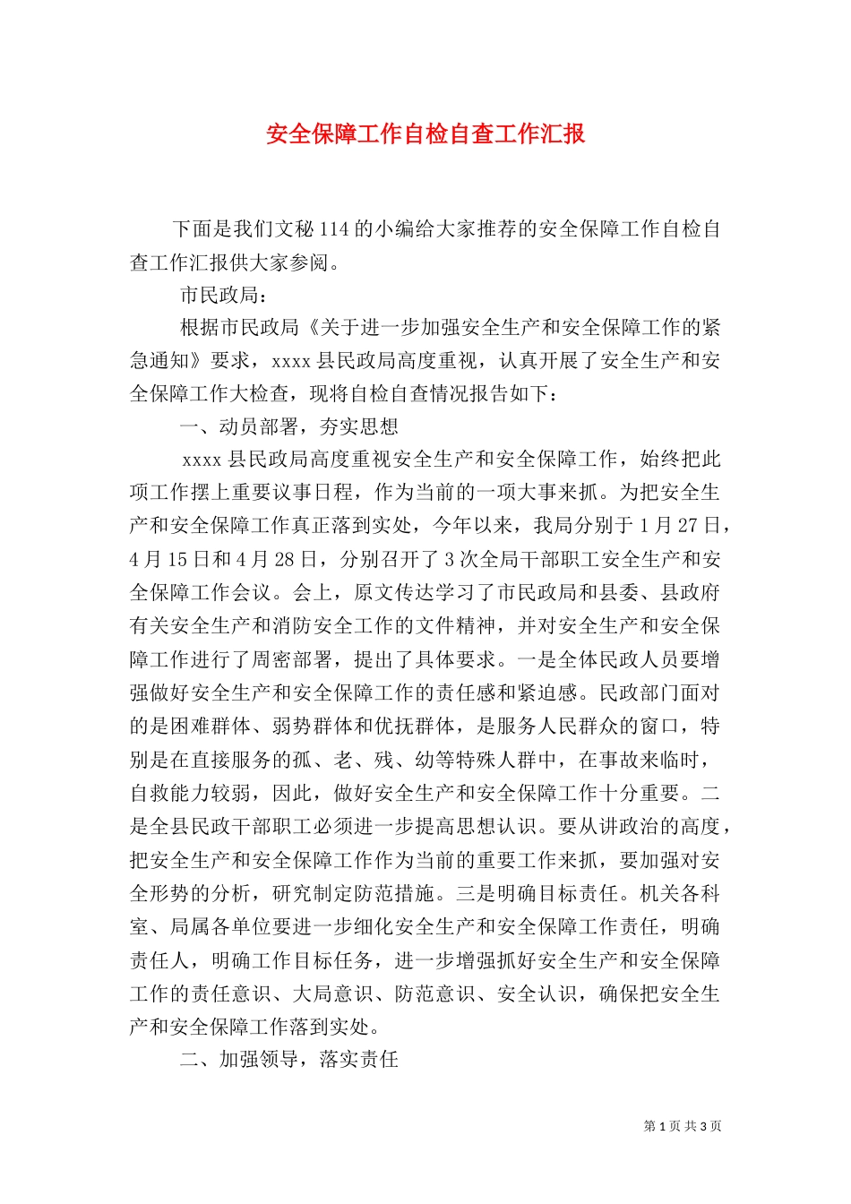 第1页共3页书山有路勤为径,学海无涯苦作舟。安全保障工作自检自查工作汇报下面是我们文秘114的小编给大家推荐的安全保障工作自检自查工作...