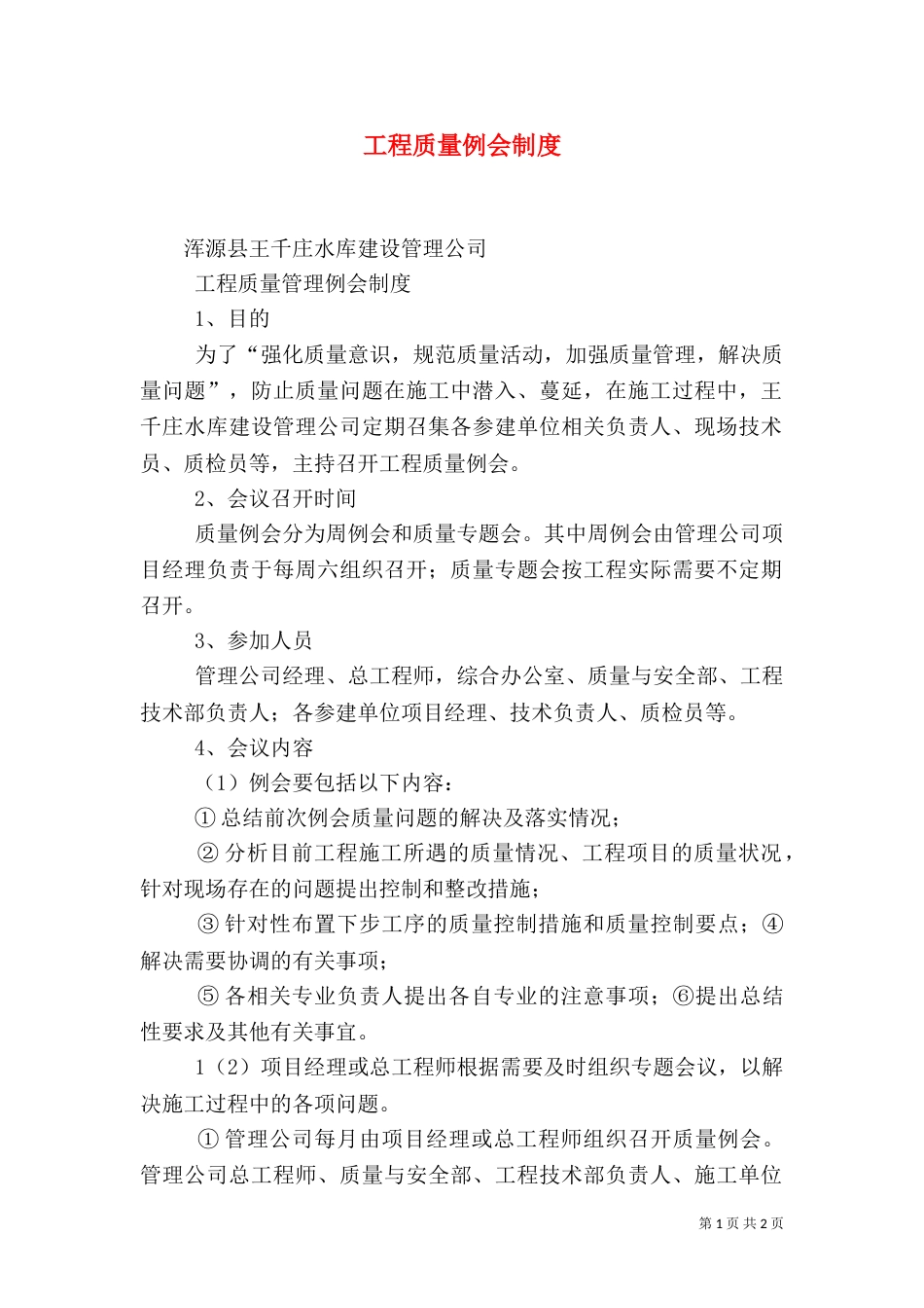 第1页共2页书山有路勤为径,学海无涯苦作舟。工程质量例会制度浑源县王千庄水库建设管理公司工程质量管理例会制度1、目的为了“强化质量意...