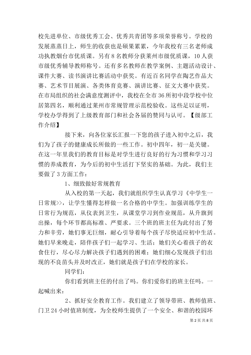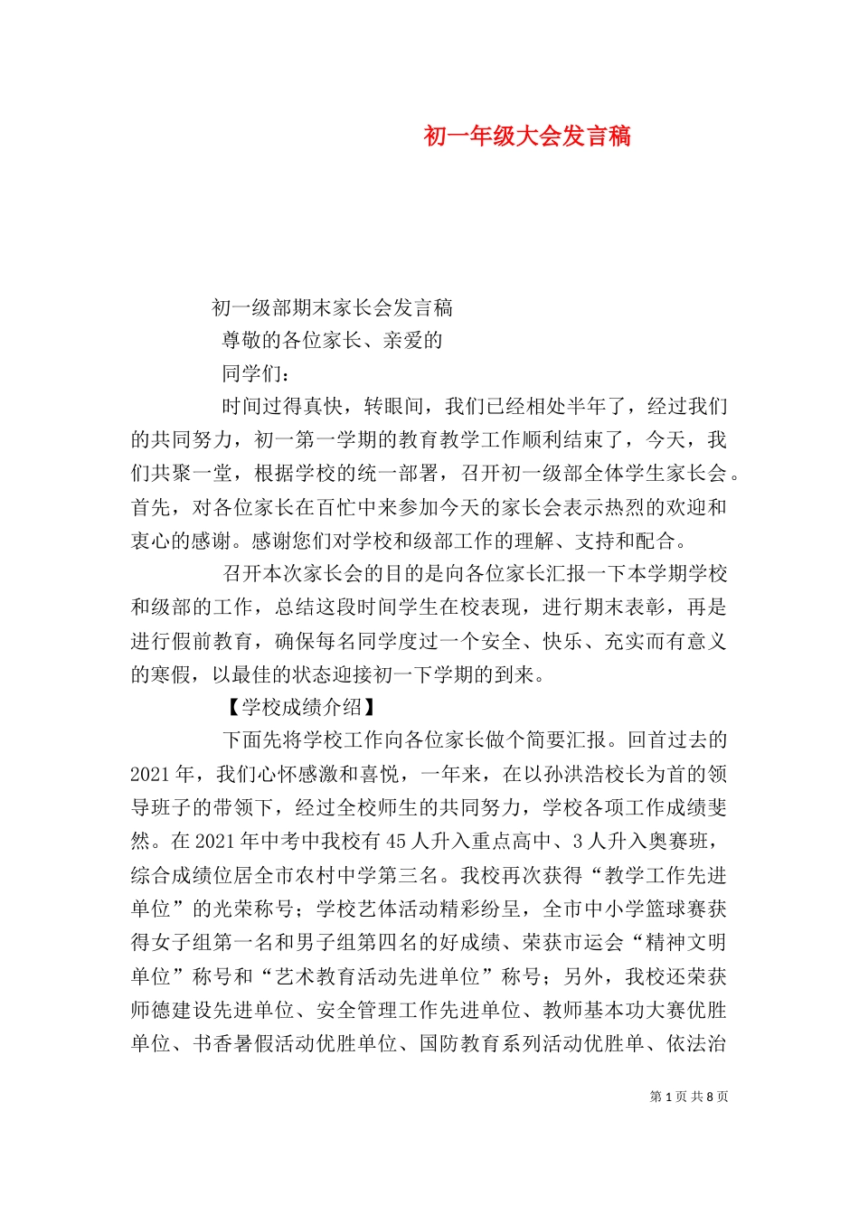 第1页共8页初一年级大会发言稿初一级部期末家长会发言稿尊敬的各位家长、亲爱的同学们:时间过得真快,转眼间,我们已经相处半年了,经过我...