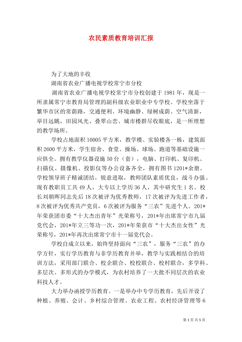 第1页共5页书山有路勤为径,学海无涯苦作舟。农民素质教育培训汇报为了大地的丰收湖南省农业广播电视学校常宁市分校湖南省农业广播电视学校...