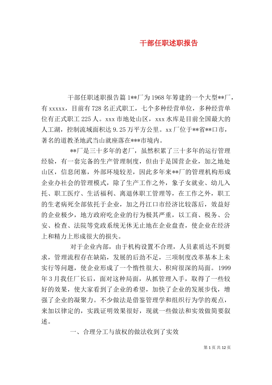 第1页共12页干部任职述职报告干部任职述职报告篇1**厂为1968年筹建的一个大型**厂,有xxxxx,目前有728名正式职工,七个多种经营单位,多种...