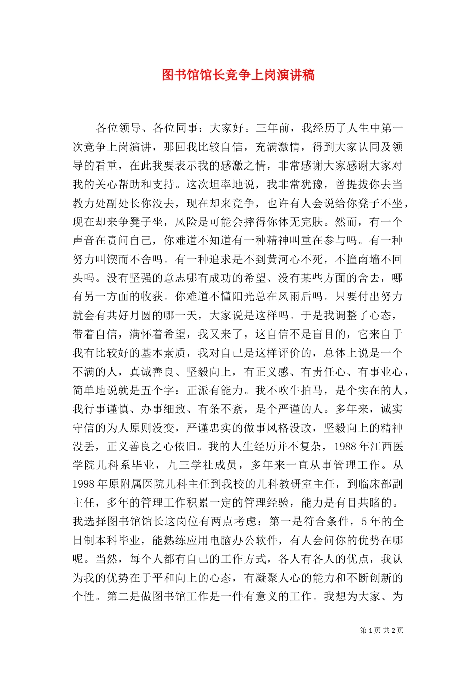 第1页共2页书山有路勤为径,学海无涯苦作舟。图书馆馆长竞争上岗演讲稿各位领导、各位同事:大家好。三年前,我经历了人生中第一次竞争上岗...