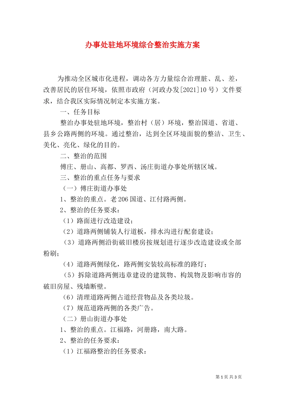 第1页共3页办事处驻地环境综合整治实施方案为推动全区城市化进程,调动各方力量综合治理脏、乱、差,改善居民的居住环境,依照市政府(河政...