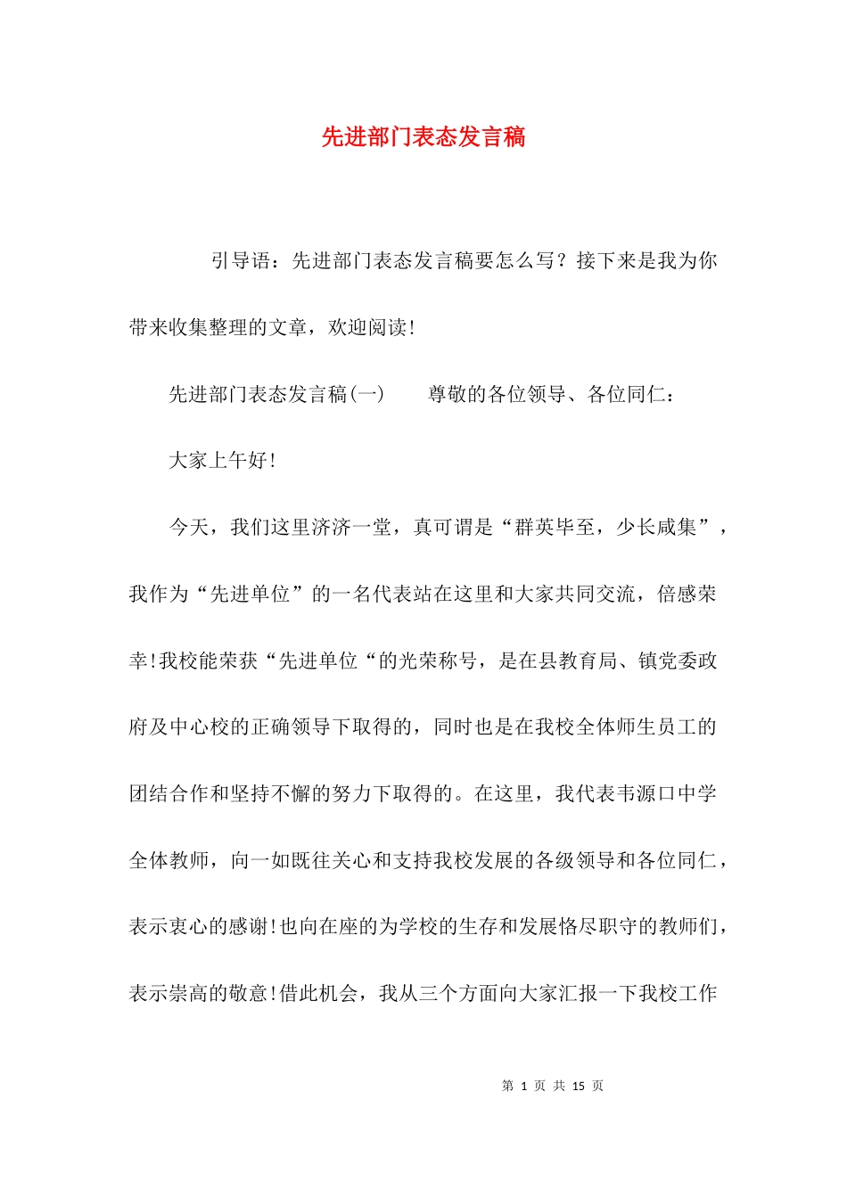 第1页共15页先进部门表态发言稿引导语:先进部门表态发言稿要怎么写?接下来是我为你带来收集整理的文章,欢迎阅读!先进部门表态发言稿(一)...