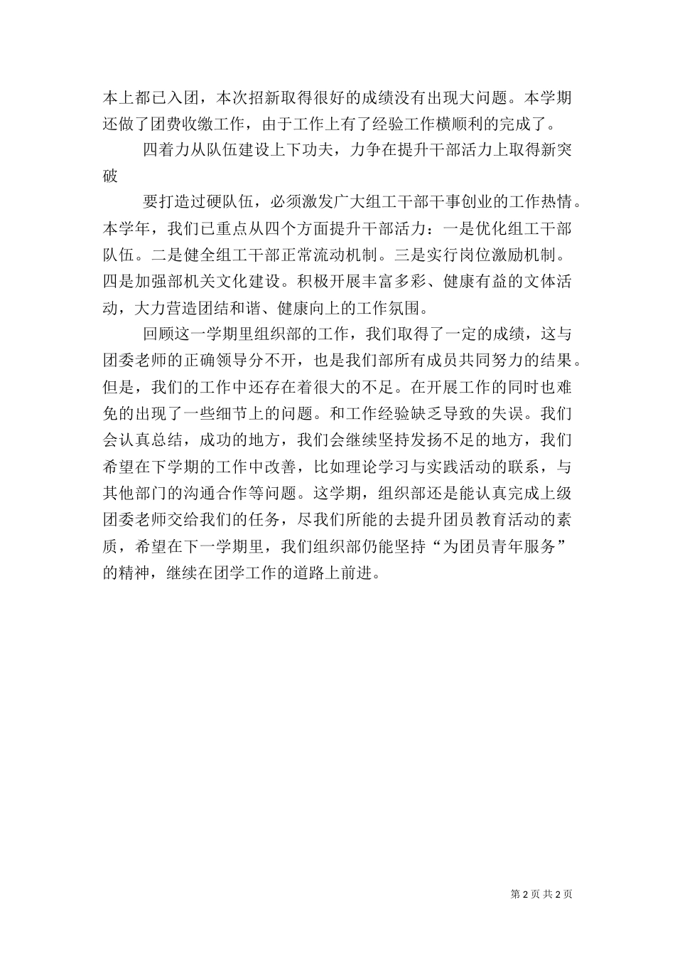 第1页共2页书山有路勤为径,学海无涯苦作舟。有关组织部的年度工作总结范文20xx上半年将过,组织部本学期的工作也顺利落幕。在校团委老师的...